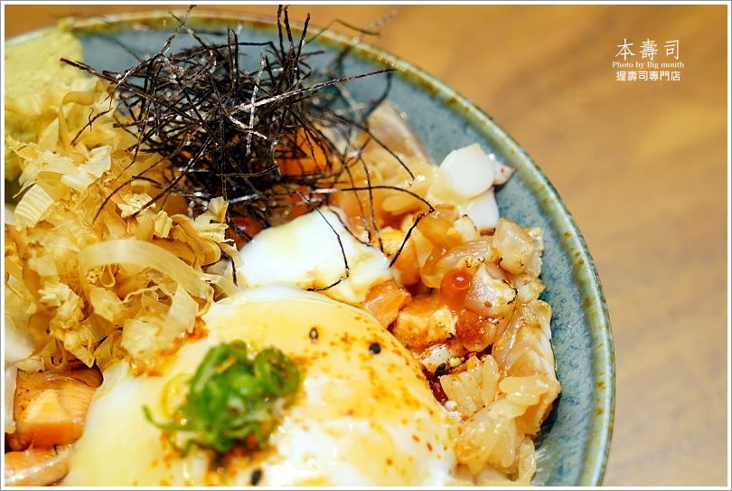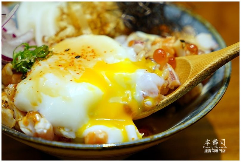 ▼魚肉有先炙燒過,所以吃起來不僅更吃到鮮甜軟嫩的口感,還有炙烤過的香氣~搭配醋飯、滑嫩溫泉蛋與鮭魚卵更為提味好吃!