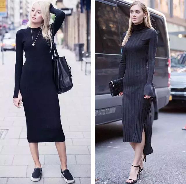 緊身款的針織裙包裹著身材,中長的純黑色,很有顯瘦的效果哦。