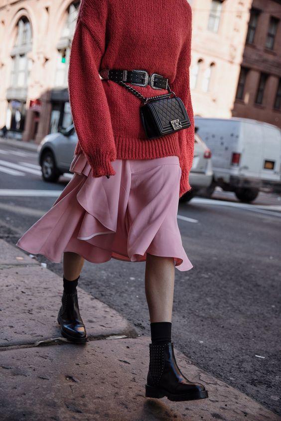 粉色的百褶裙與繫帶鞋很好地中和了灰色毛衣的沉悶感,和溫暖慵懶的毛衣配一身就是浪漫舒適的存在。