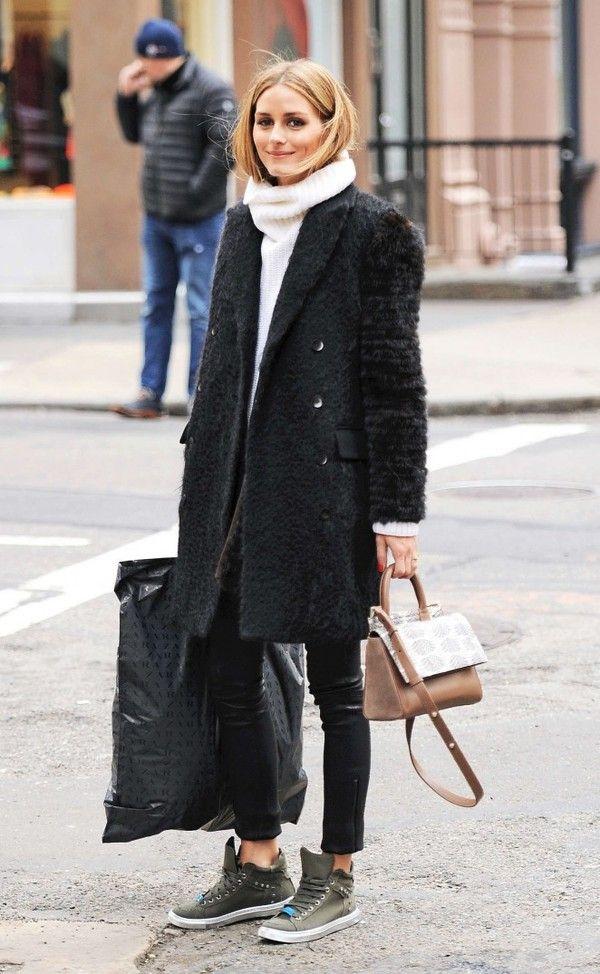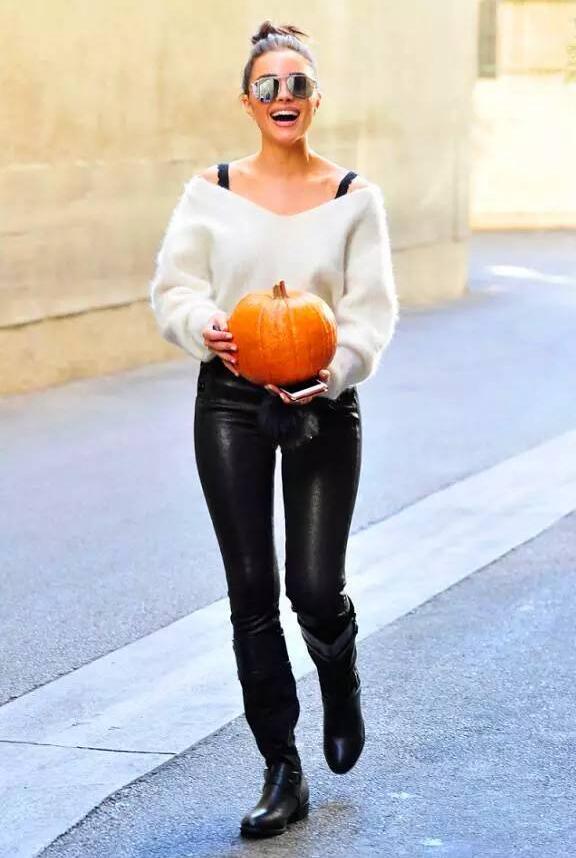 如果不想讓整套Look顯得沉重,可以像Olivia 這樣用寬鬆毛衣+黑色皮Legging,