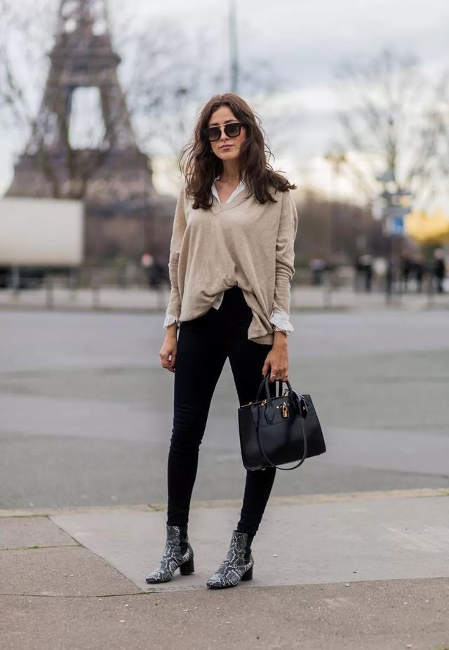 如果是純色、極簡設計的Oversized毛衣,可以在包包和鞋子等配飾上多花些心思,來緩解毛衣和Leggings的單一。