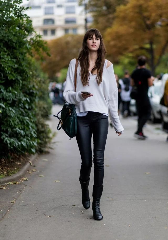 毛衣+黑色皮Leggings+小白鞋也是不會出錯的經典穿法。