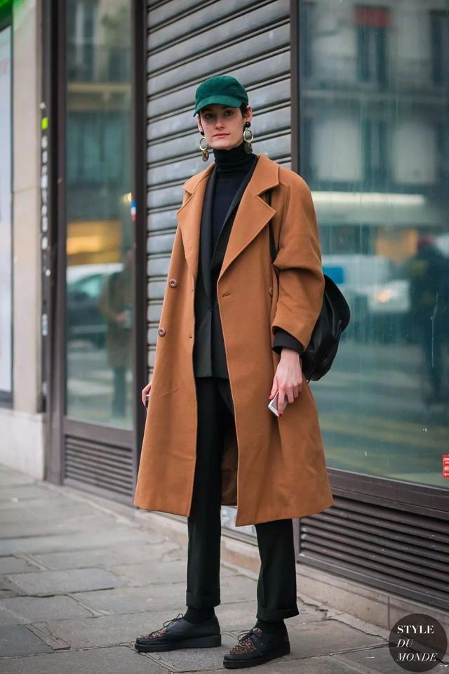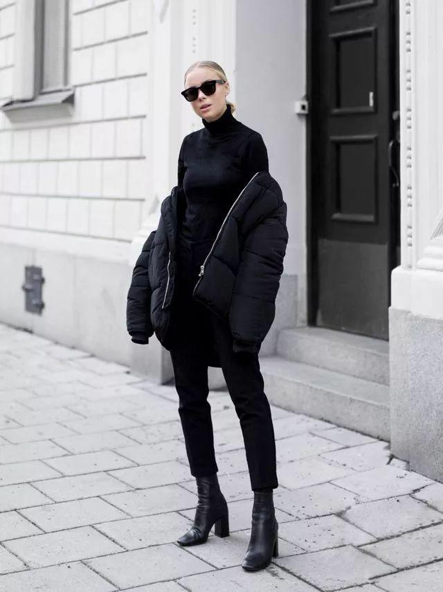 廓形的棉服,例如oversize的飛行員夾克,本身就帶有不擋風的領口,而且還不太適合搭配圍巾等,因此內搭貼身的黑色高領針織就在合適不過了。