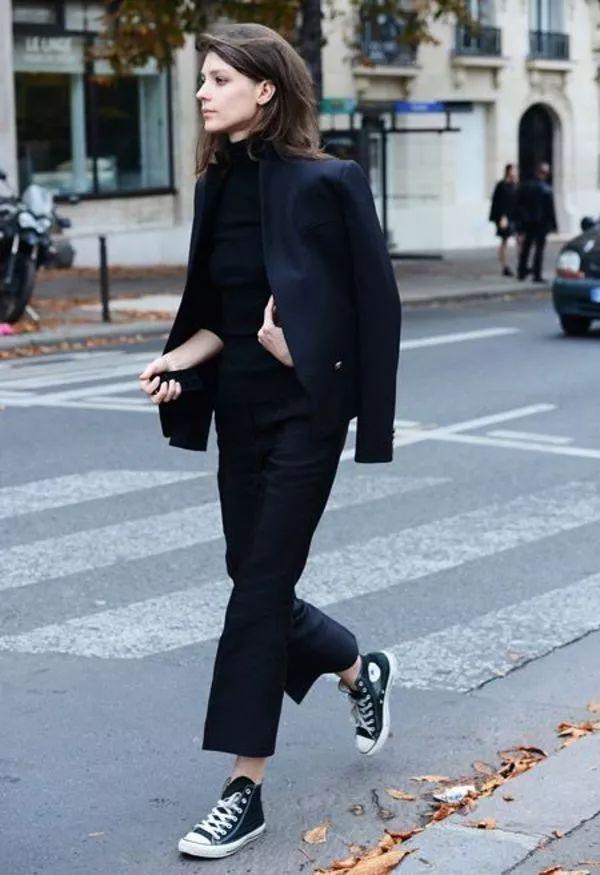 一身黑也是酷炫十足,搭配運動板鞋則能能減弱距離感,讓黑的更加親切。