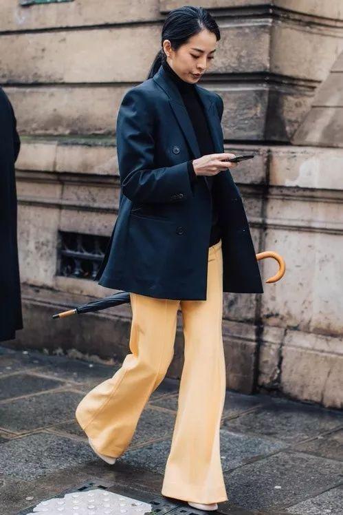 再闊腿褲的選擇上,更是可以選擇色彩的,撞色可以毫無限度,因為黑色針織都完全hold的住。