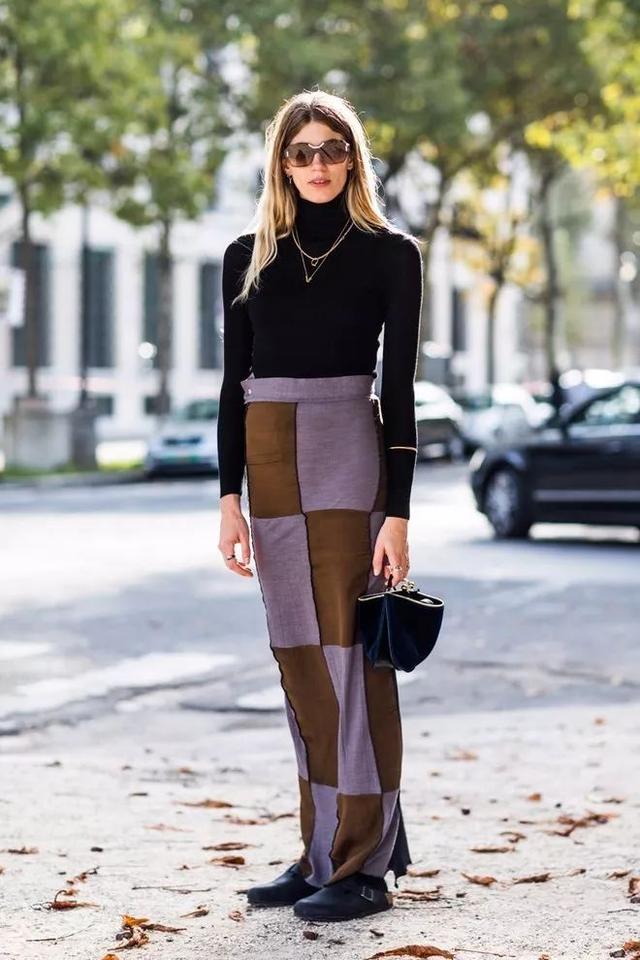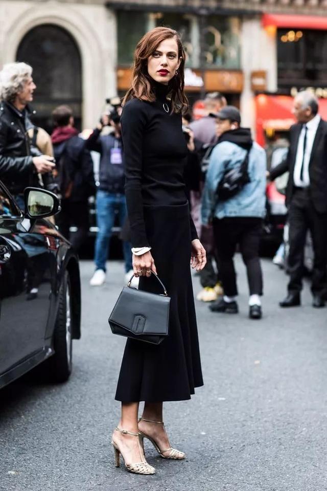 如果還是不想露腿,那不妨試試半身長裙,在黑色沉穩的烘托下,身材比例會顯得更好哦。