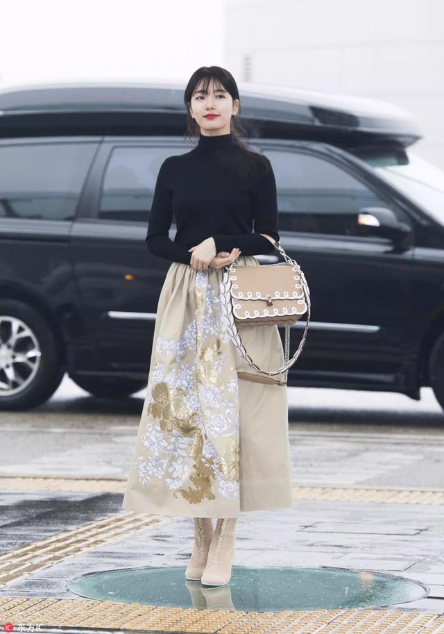 從容優雅從來不需要太多的修飾,秀智這一套黑色煙囪領針織打底,搭配裸色系印花復古傘裙,令人十分的印象深刻!