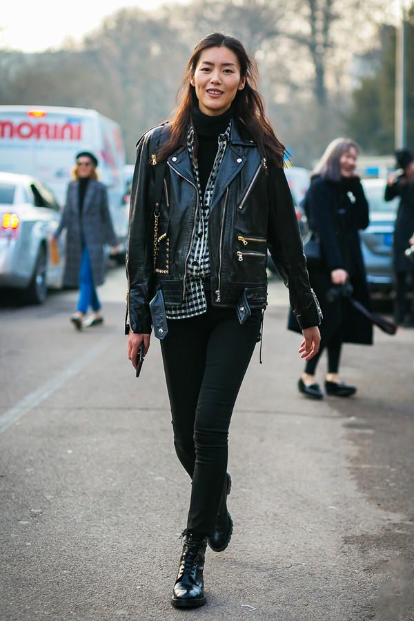 縱使有格子開設,機車夾克兩件外套的層層阻礙,也絲毫阻擋不了黑色打底在大表姐劉雯這套LOOK中的加分錶現。