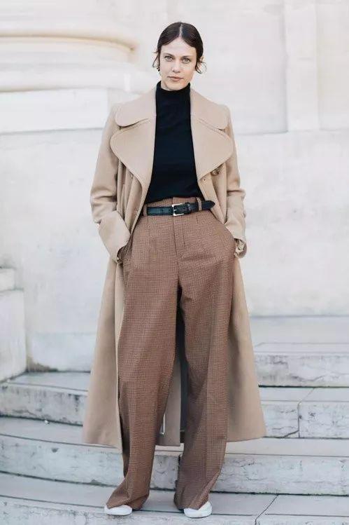 現下講到褲裝,不聊闊腿褲的都根本跟不上潮流。黑色針織搭配闊腿褲的這種“上緊下送”的穿法,往往能達到意想不到的顯高顯瘦效果。