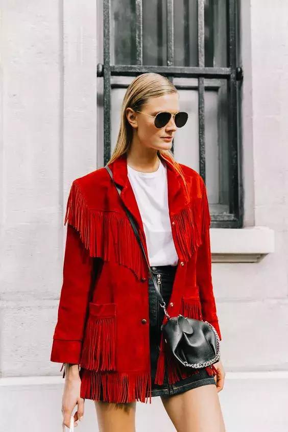 流蘇在短款外套上更有發展空間,可點綴於胸前,可連貫於雙袖,也可遍布於背部。 皮質的流蘇給人更多的是一種瀟灑帥氣的不羈感。 長款外套的流蘇大多裝飾在邊緣或下擺處,在視覺效果上拉伸了版型,也讓整體輪廓更加明顯。 長款流蘇突出風情,短款流蘇則增加了些許小俏皮。 宇宙級網紅、天生衣架子的肯豆,穿上非常挑人的紅色流蘇外套內搭黑T恤和白褲子,可性感可酷帥! 酷女孩們還可以選擇麂皮機車外套做冬季搭配,結合細長的流蘇穗子十分有型,讓冬季搭配不再沉悶。 粗格呢外套非常具有名媛氣息,不光要想拒絕千篇一律的款式, 不妨選擇帶流蘇元素的外套,更有甜美可愛的感覺。 不敢嘗試把流蘇穿上身,那就先從流蘇包包開始把。 不論是手提還是手拿, 流蘇包包都是身上一個不可忽視的亮點,細長的穗子自由隨風的動感會不自覺吸人眼球。 純色包包加上大面積流甦的配合,無形中拓展了包包的空間。 不同顏色的流蘇演繹不同的質感,或清新脫俗,或複古典雅,或深邃幽遠。 馬鞍包復古氣息頗為濃厚,再搭配流蘇作為點綴,更增加了造型上的層次感。 當然了個性一點的女孩們也可以選擇大條編織流蘇包來拗造型,相信會讓你在寒冷的季節加分很多。 紅色的流蘇包包也是點綴搭配的亮點,樸實的皮質面料溫婉文藝,結合溫醇的紅色有點小小的慵懶感。 一款成功的造型少不了耳環的點綴,有了它彷彿猶如神助攻一般,定會為你增添不少光彩。 長款流蘇耳環這兩年也不少件, 線條款式的耳環會修飾你的臉型,柔化面部輪廓,把你的臉襯託的非常小。 如果你是小臉MM那麼恭喜你, 大膽試一試誇張的流蘇耳環吧,即便你只穿一件白打底都會非常好看的。 有了完整的造型再加上小小的流蘇耳環點綴,讓整體看起來更chic哦! 還有這種小清新款式供你選擇,雖然它還是挺考驗穿著人的功力的,但是吸睛指數絕對妥妥的NO.1! 這種仿晶鑽的款式的流蘇耳環絲毫不做作, 無論是搭配襯衫還是衛衣都能讓你的簡約造型更勝一籌,也獲得型人們的青睞。 看完的小仙女們心裡一定是如下圖所想▼