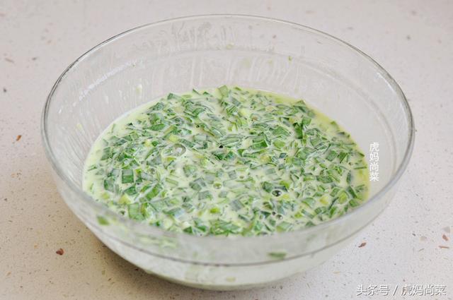 再加入清水拌勻,成稍濃的糊狀,無麵粉顆粒,最後放入鹽再次拌勻即成韭菜麵糊。