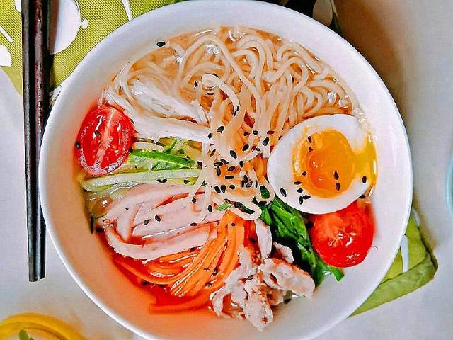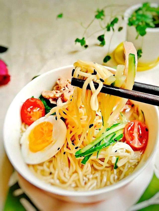 鹼水麵一包、黃瓜20克、豬肉(瘦) 20克、蔥10克、火腿30克、聖女果兩個、金針菇30克、烏雞蛋兩個、紅蘿蔔20克、精鹽1克、濃湯寶一塊、花生油2克、芝麻1克、芝麻油5滴、醬油1克
