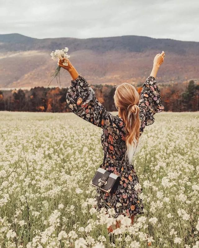 印花的穿搭,富有女性氣息的花朵印花穿上甜美感十足,在開闊的風景中,大片印花顯得更為熱情大方。
