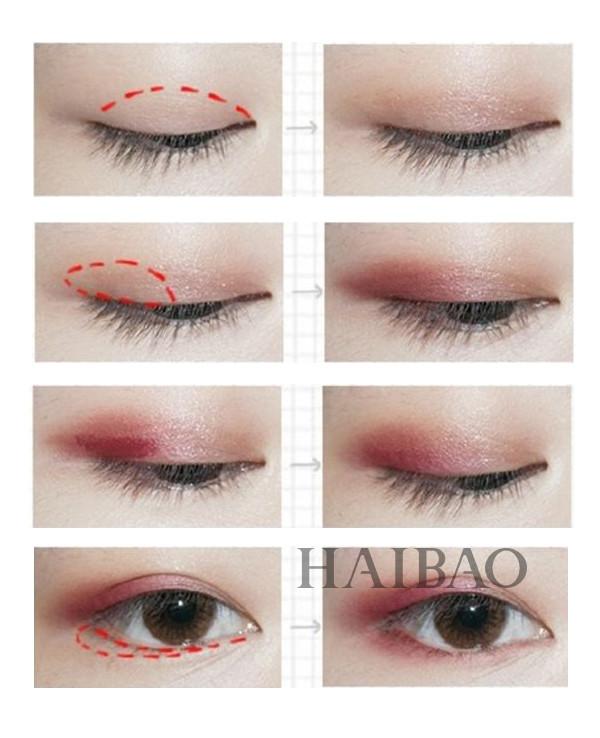 正常地畫好上眼影後,我們可以選擇眼影中最深的顏色暈染在下眼尾的後1/3段,中段和前段輕輕地刷上嘴淺色的眼影即可。