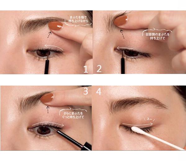 然後向眉頭的位置提起眼皮由睫毛中部往眼頭的方向畫內眼線,最後再由眼頭向眼尾描繪一次內眼線並用棉籤修整一下就完成了。