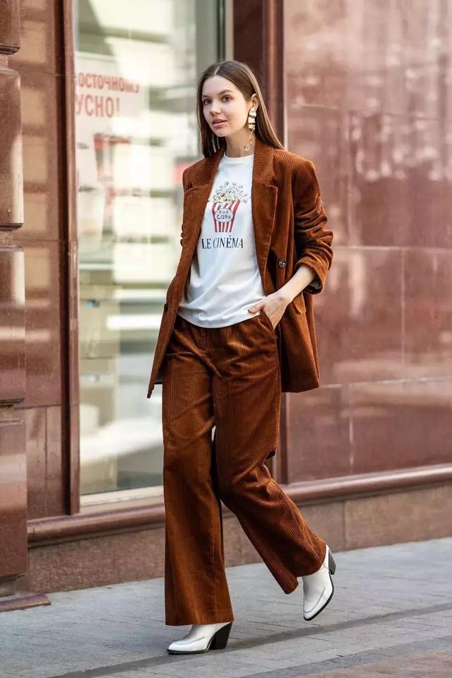 當然,現在最最時髦的搭配方法,不是出搭裙也不是搭褲,而是要從頭到腳條絨,一穿就穿一套!