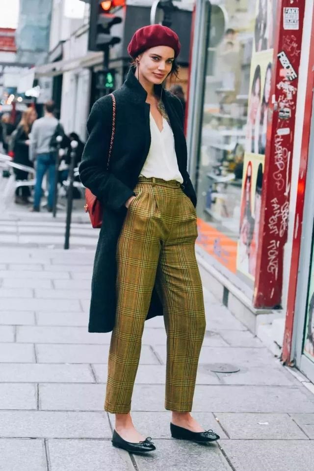 格紋微喇褲搭配拼接羊羔絨大衣復古文藝範兒,運動鞋顏色和大衣做了呼應。