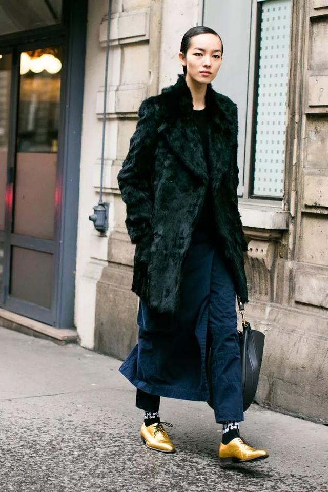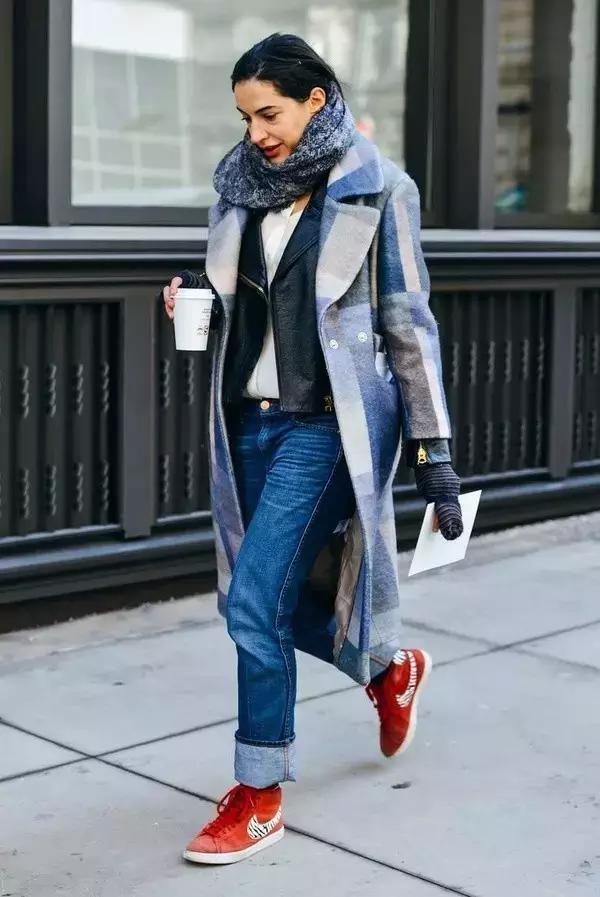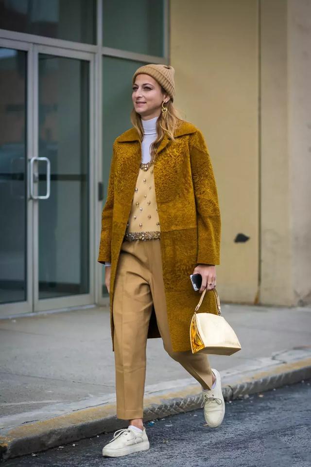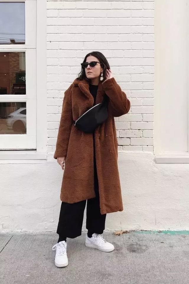 穿毛絨大衣時也可以搭配運動鞋來減輕厚重感,營造輕盈的時髦造型。