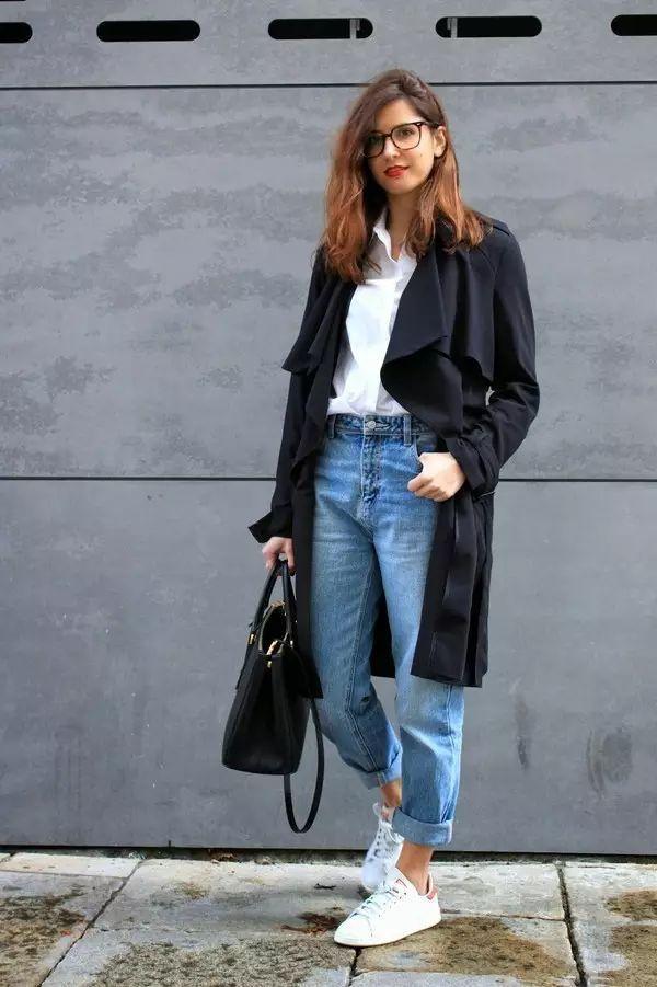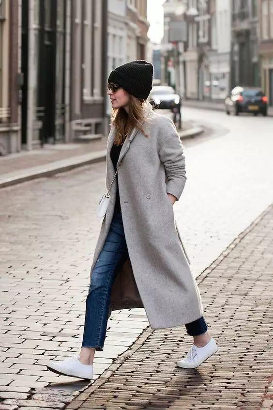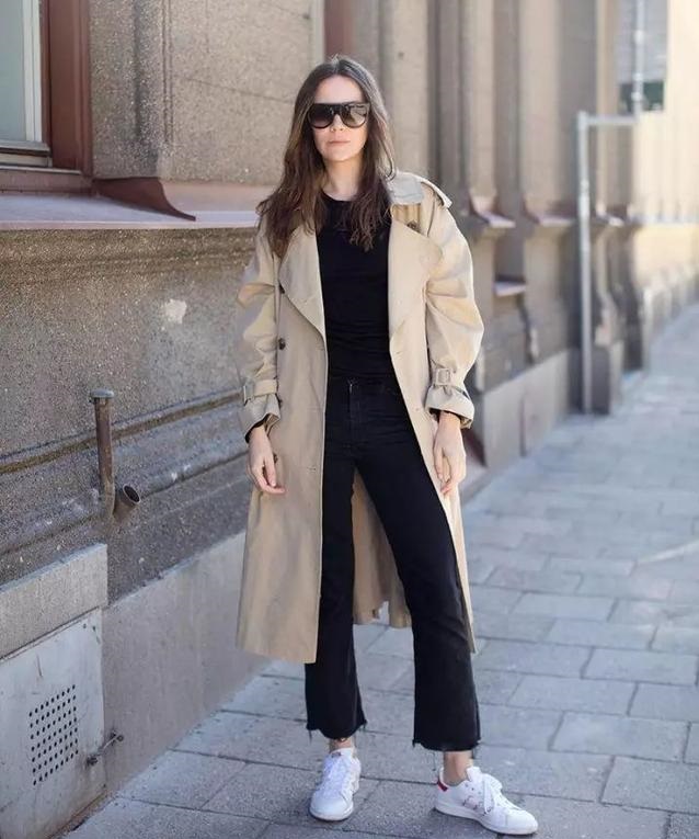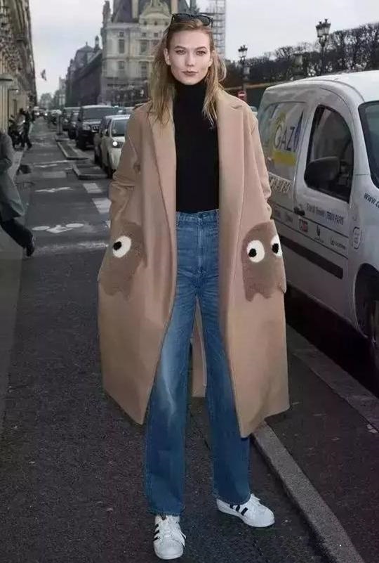 微喇褲+運動鞋在選擇大衣時,一般選中等長度,避免過長的的大衣把整個人壓縮了。