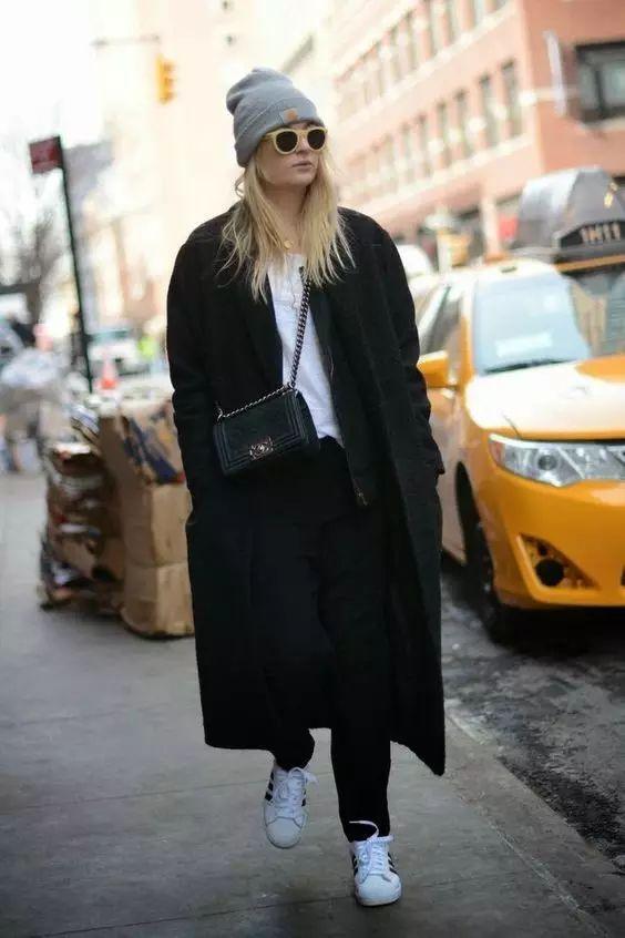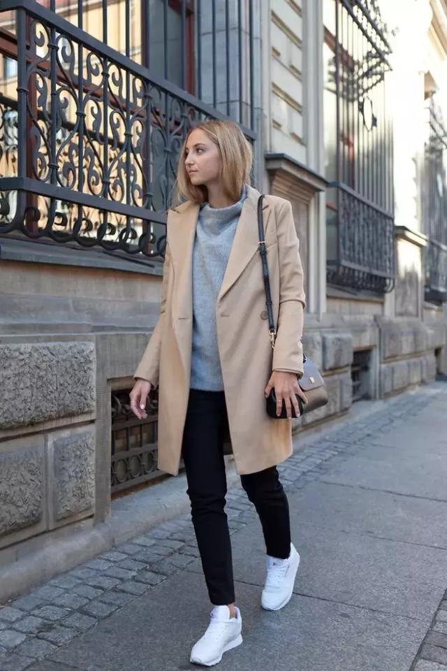大衣和運動鞋這兩件相對來說比較有存在感的單品搭配低調的小黑褲,顯瘦顯高還不會覺得搭配過於繁冗。