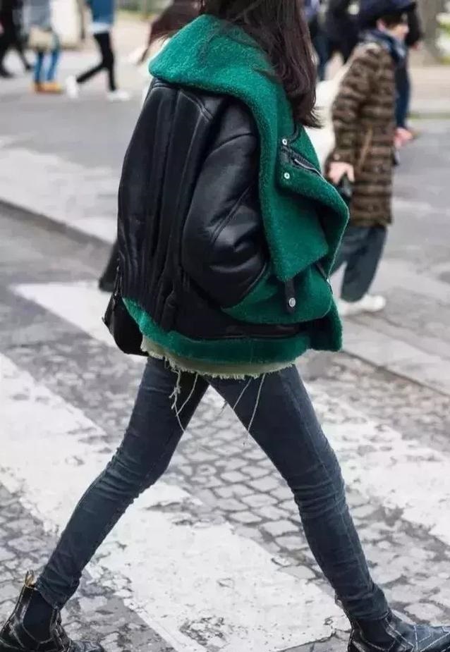 短一點的袖口拼毛外套要比長外套更考驗搭配功底一些,畢竟手放下來的長度到胯這裡,加了毛毛就給人感覺側面變寬了,穿衣服的時候得控制好身高比例才行。