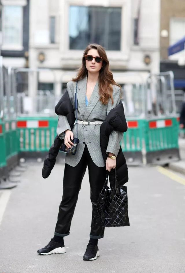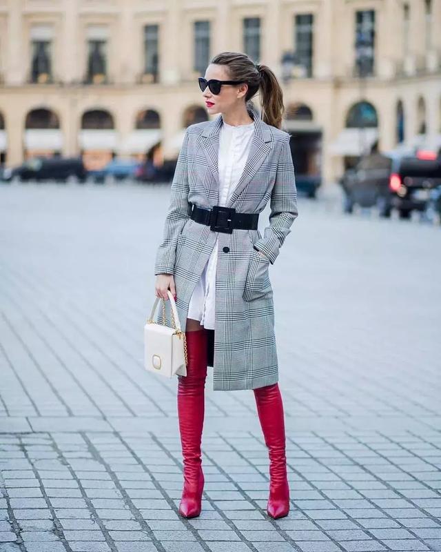 或者你更有創意的換一條比較運動Style的腰帶,和氣質的千鳥格西裝搭配就很有混搭感,這一套搭配一雙過膝靴,超級nice。