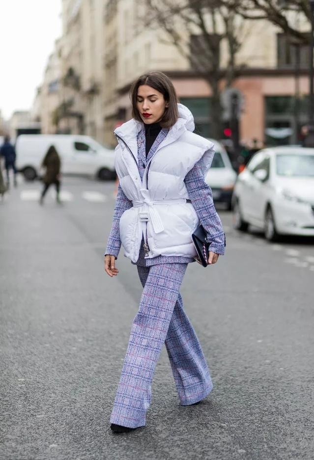 紫色大衣搭配灰色的A字針織裙本來是很女性化的一個配色,
