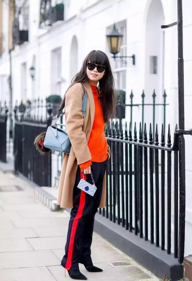搭配大衣的時候可以換個思路,把運動褲當做有側條紋裝飾的直筒褲,