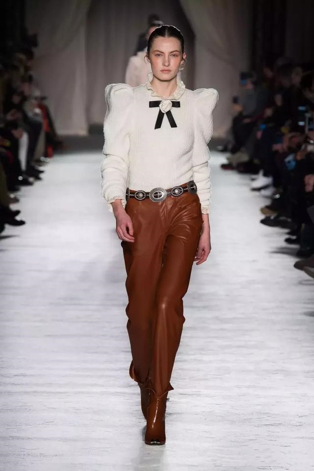 高腰的花苞型皮褲也很有特色,超高的腰線配上短款針織毛衣、小高跟,分分鐘穿出逆天大長腿的既視感~