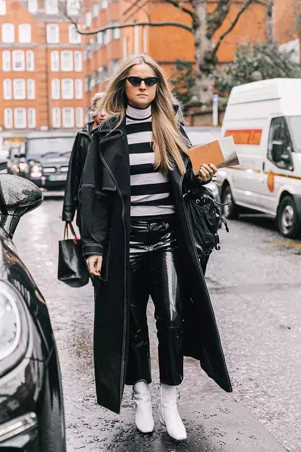 氣質優雅的風衣搭配搶眼的漆皮褲,讓整體的造型更有看點,