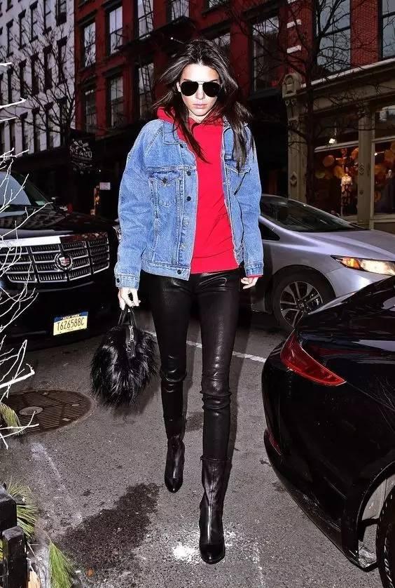 衛衣還可以疊穿牛仔外套,搭配撞色直筒皮褲、豹紋靴,再利用腰帶來收緊線條,時髦精本人了!