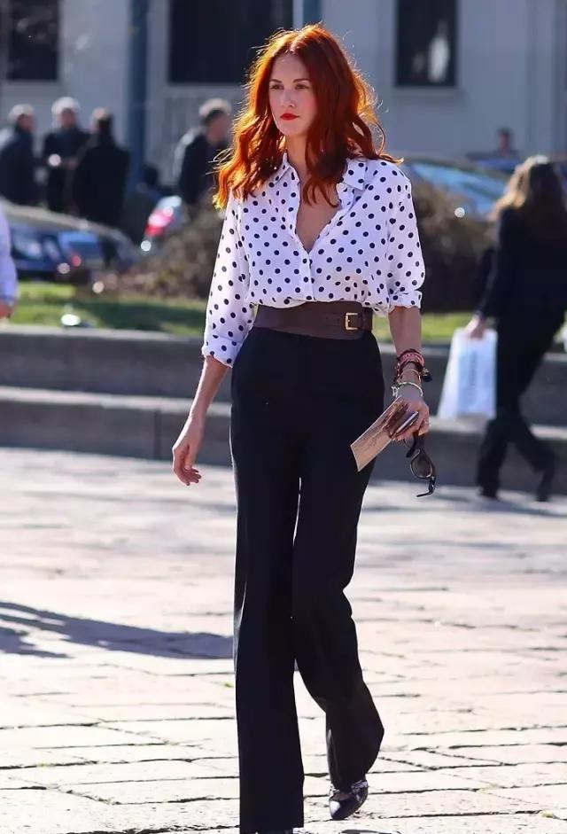 V領款的波點襯衫顯瘦功力一百分,搭配闊腿褲就能凸顯氣質。
