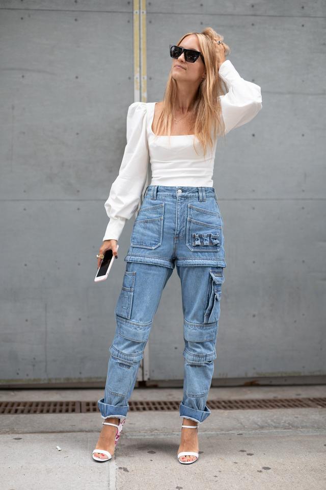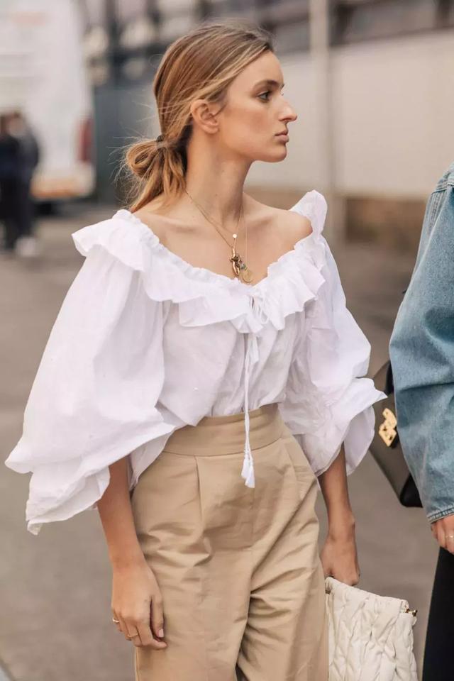 款式選好了搭配就不難,因為Milkmaid襯衫本身就屬於比較有特點的,所以下半身搭配簡簡單單就可以。