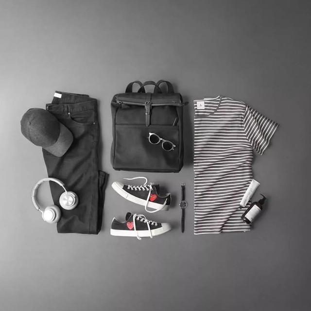 黑色休閒西褲+灰白條圓領短袖衫+黑色休閒帆布鞋+黑色休閒雙肩包+ 太陽墨鏡+ 麻灰色棒球帽+ 手錶