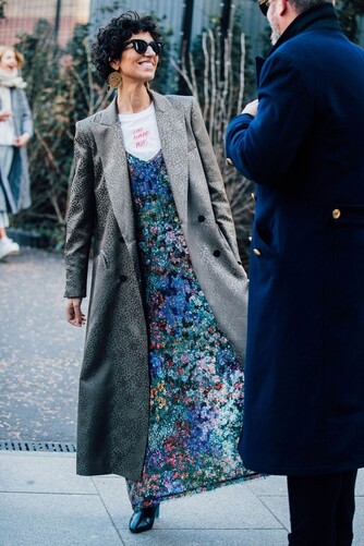 印花裙與牛仔褲的疊穿,略帶復古浪漫。