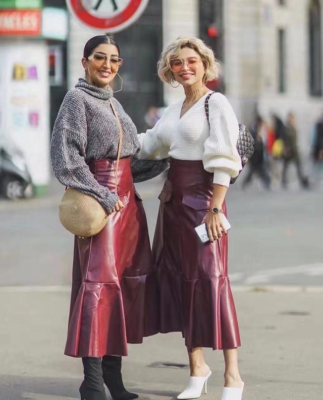 同一條紅色皮裙,只不過一個紅一些,一個紫一些,再搭配不同的單品,整體看起來協調有序,不愧為最佳姐妹情。