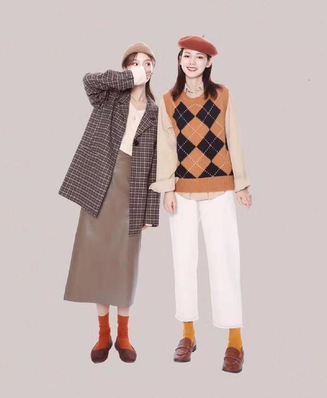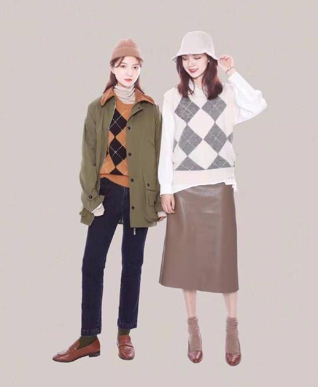 對於青春美少女來說,想穿出閨蜜風來,可以選同一件內搭菱格背心毛衣,不同的顏色搭配不同的相應單品,一個帥氣,一個甜美,各有鞦韆,互不防礙但又都美成仙。