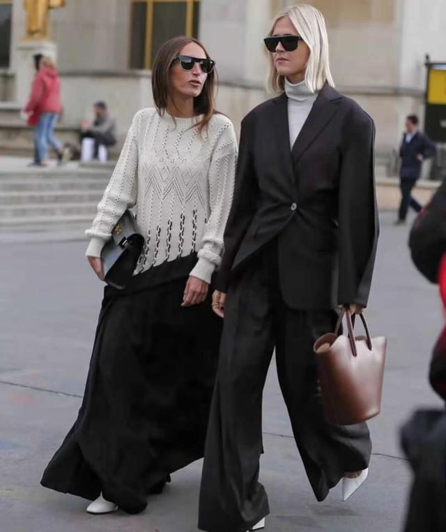 年輕就是好啊,穿起黑白灰也顯得清新自如。這一組中一個是長裙盡顯淑女本色,一個是短裙活潑靈動,但有了黑色和白色呼應,反而更加協調。