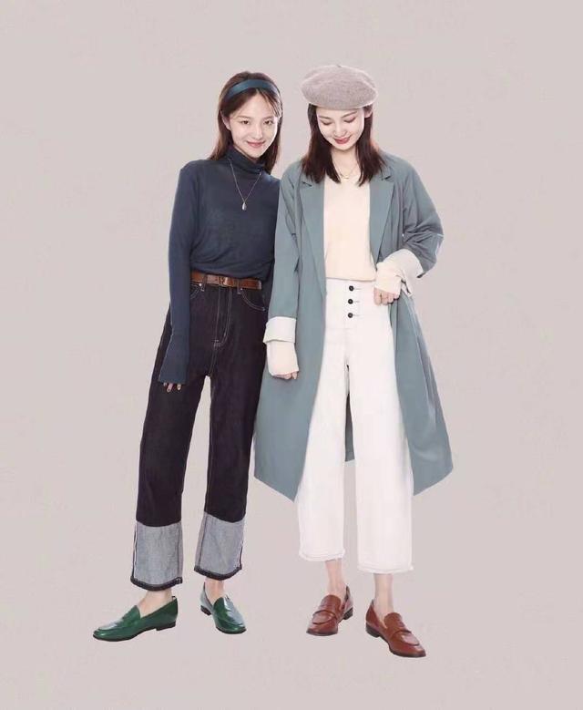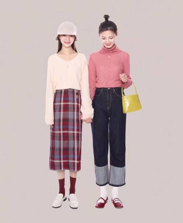 當兩個人的風格和氣質特點不一樣時,利用顏色呼應是最恰當的了。左邊這套白色毛衣搭配紅格紋半裙,清純可愛;右邊這套粉色高領毛衣搭配牛仔闊腿褲,乾淨又氣質。她選的是紅色復古方頭平跟鞋,和左邊紅色格裙相呼應。