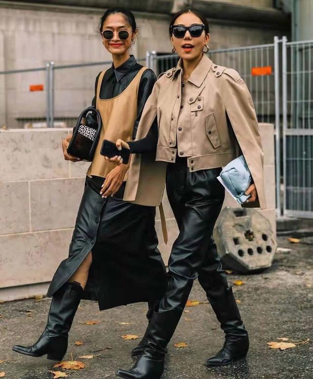 這一組都是皮革為主,酷帥又是時髦。一個裙裝,一個皮褲,風格一致,也是蠻協調的。