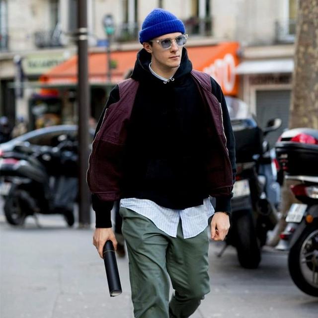 這種搭法雖然非常簡單,但卻是最不容易出錯的方式,自在的外套內搭一件衛衣,裡面還可穿打底來豐富造型的層次感。頭上佩戴一頂冷帽凹出你想要的造型,既有看點又不會無趣。