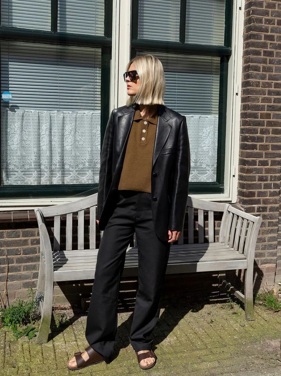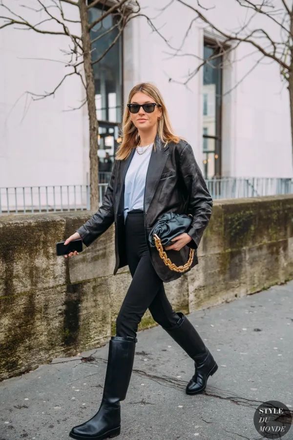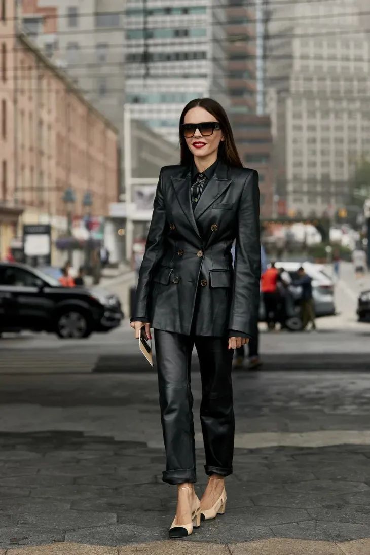 皮襯衫+皮褲穿著打造連體工裝的既視感,酷帥時髦又高級,輕鬆演繹不費力的時髦。