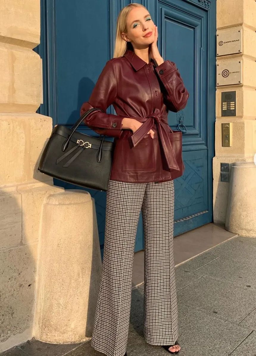 皮衣搭配闊腿褲,風格又大不同,帥氣之餘多了幾分優雅,有種酷酷成熟女孩兒的感覺~顯得更加高級。