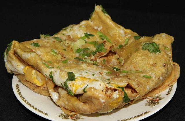 - 在雞蛋凝固之前,將手抓餅蓋在雞蛋上,用鏟子壓一壓,使雞蛋和餅粘在一起,待雞蛋熟後,翻面,再加熱幾秒鐘即可出鍋。