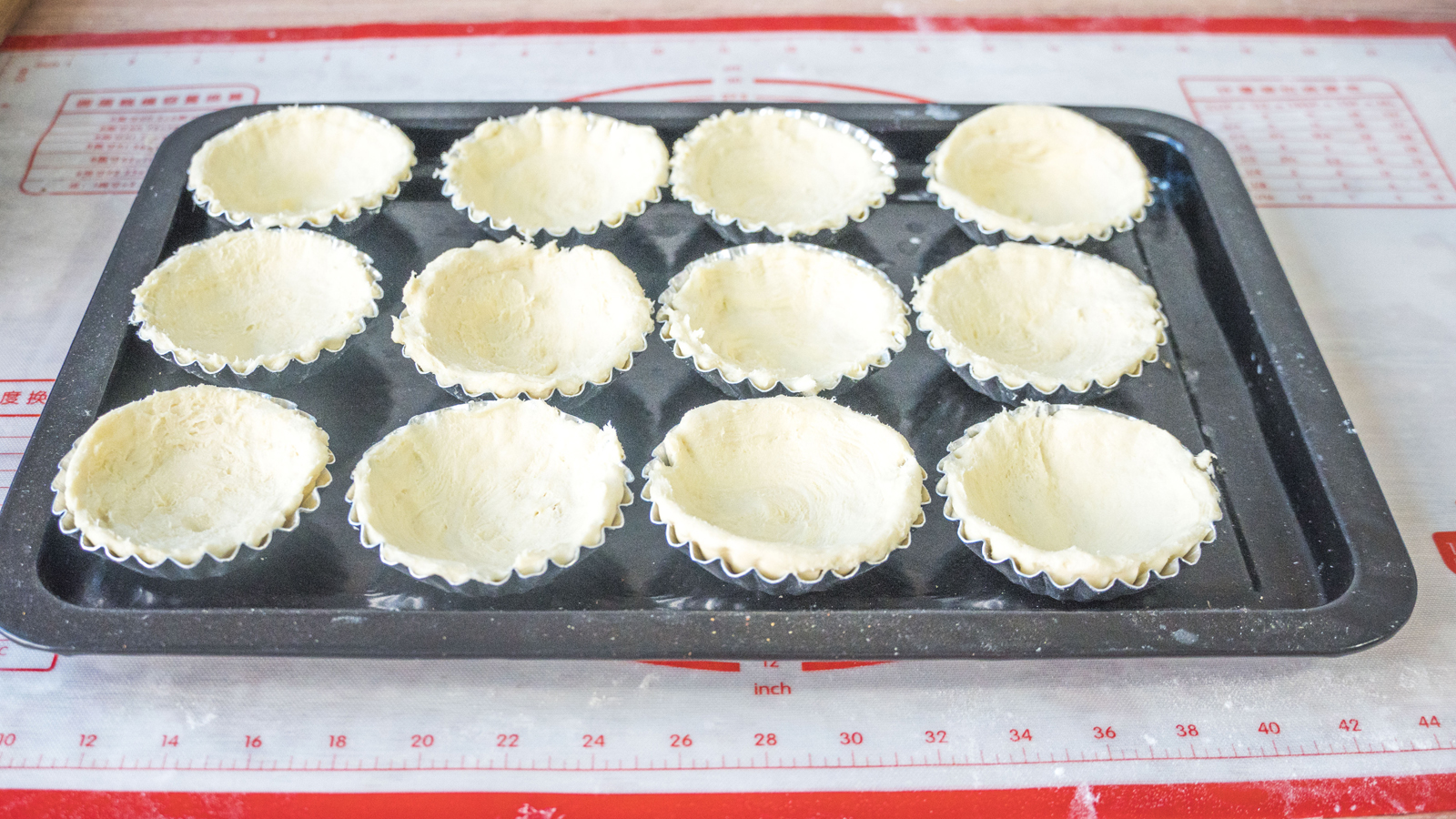 8、蛋撻模具刷一層薄薄的黃油,將麵團放進去後用兩個大拇指往邊緣按,讓麵團填滿整個模具,底部要薄一點,不然吃起來不夠酥,邊緣要比模具高出來一點點,塔皮部分就完成了;
