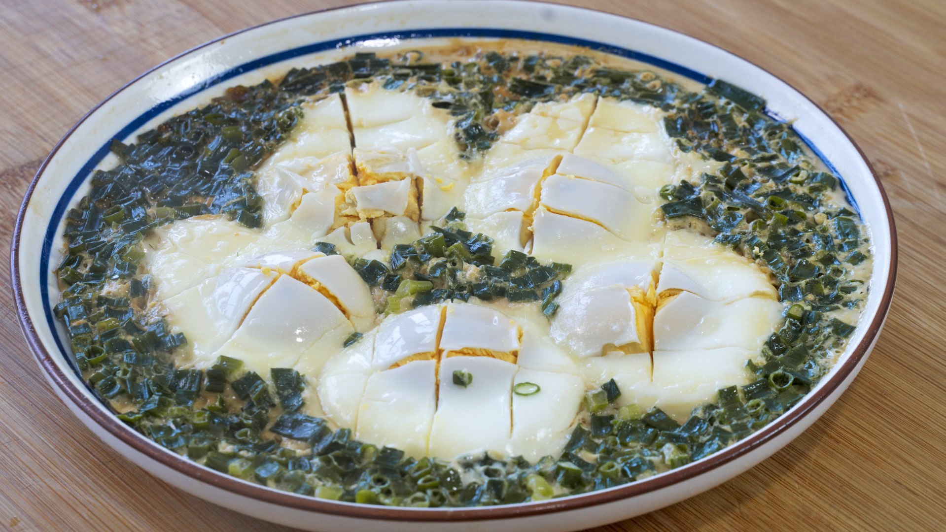 10、直接用小刀在盤子裡把雞蛋切成小塊兒,然後再把鍋裡的胡蘿蔔土豆肉沫鋪上來,最後再來點小蔥花點綴下,這道香噴噴的蒸雞蛋就做好了。