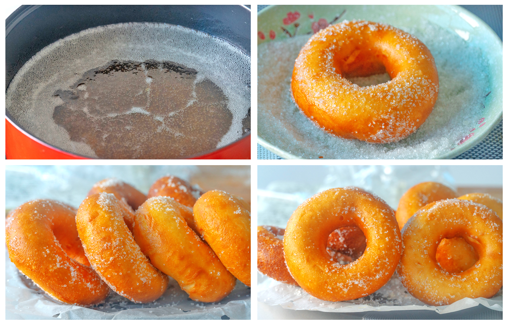 6、炸至兩面金黃就可以出鍋了,趁熱裹上白糖,香甜又柔軟的油炸甜甜圈就做好了;