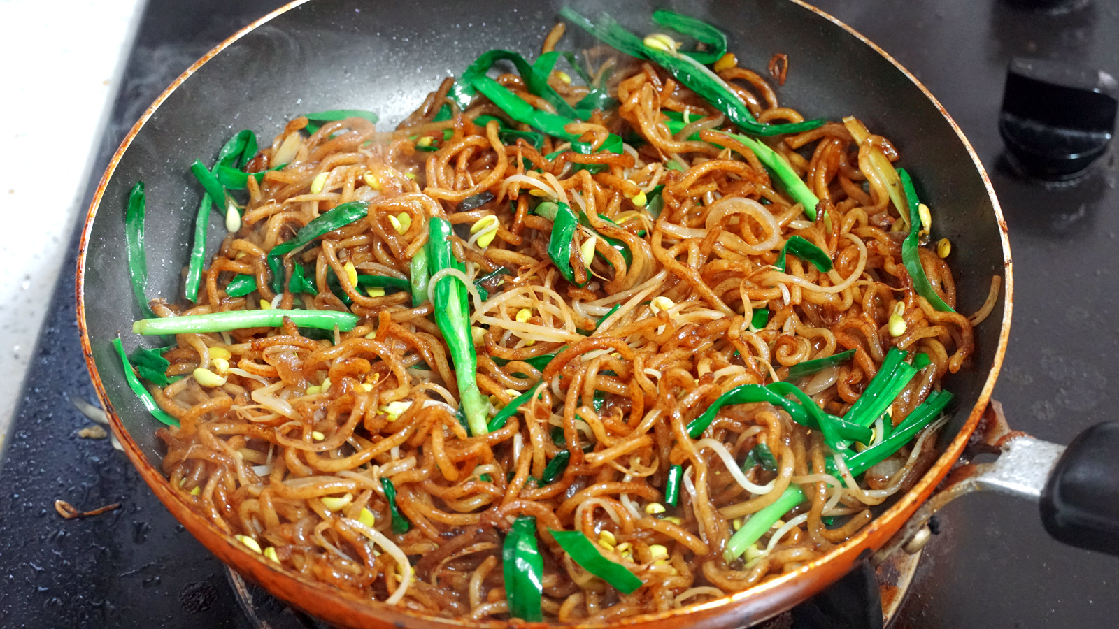 6、熱鍋倒油,下洋蔥炒香,豆芽也加進去炒一炒,蔥也加進去,豆芽炒熟了就把麵條加進去,澆上我們調的豆豉,先從鍋邊倒,剩下的一半再倒入麵餅的中間部分,從鍋邊倒主要是讓豆豉油接觸到鍋的熱力,