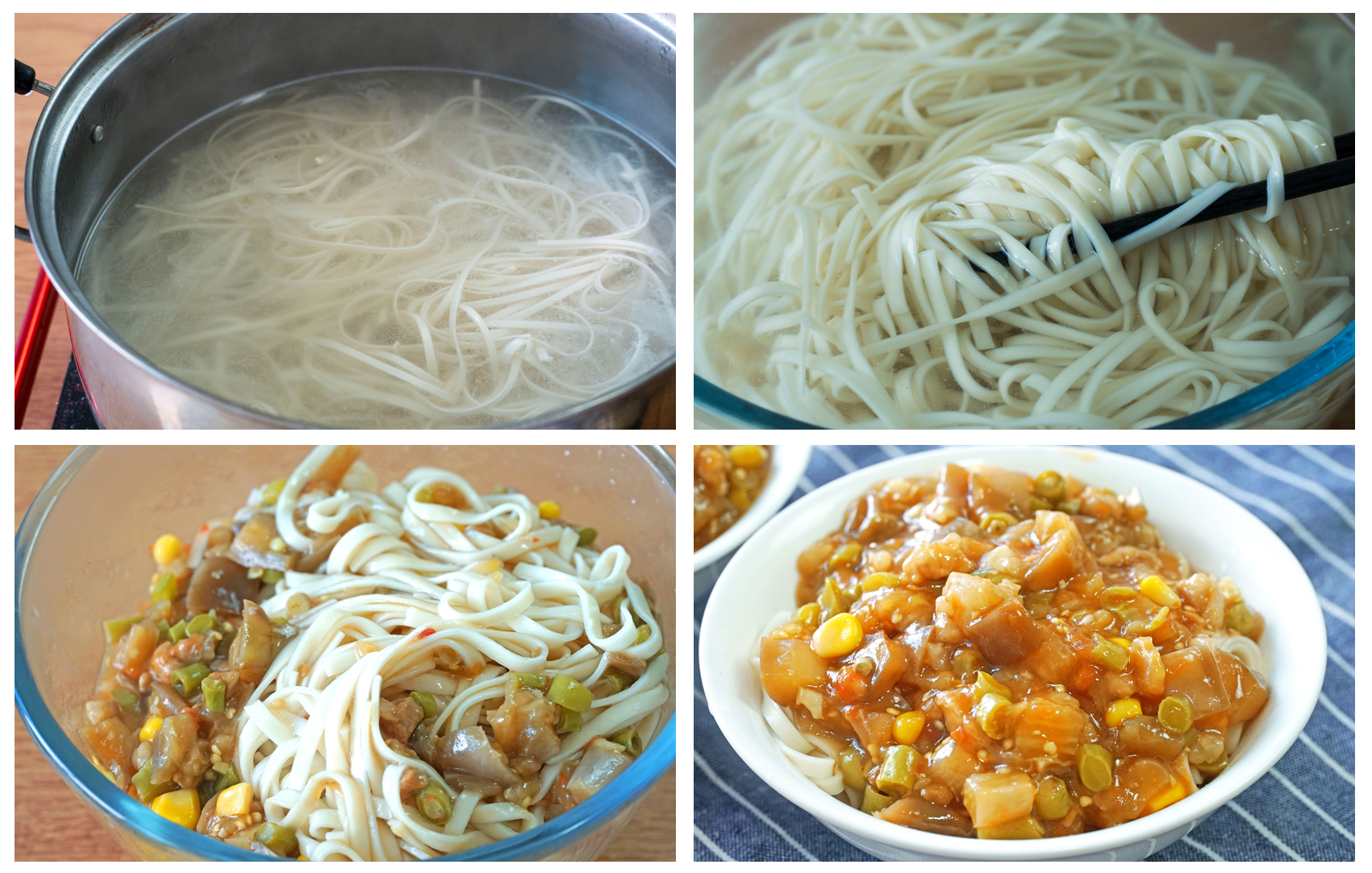 8、現在我們來煮麵條,水燒開後下乾麵條,煮熟後過一下涼水,這樣麵條不會全部粘在一起;