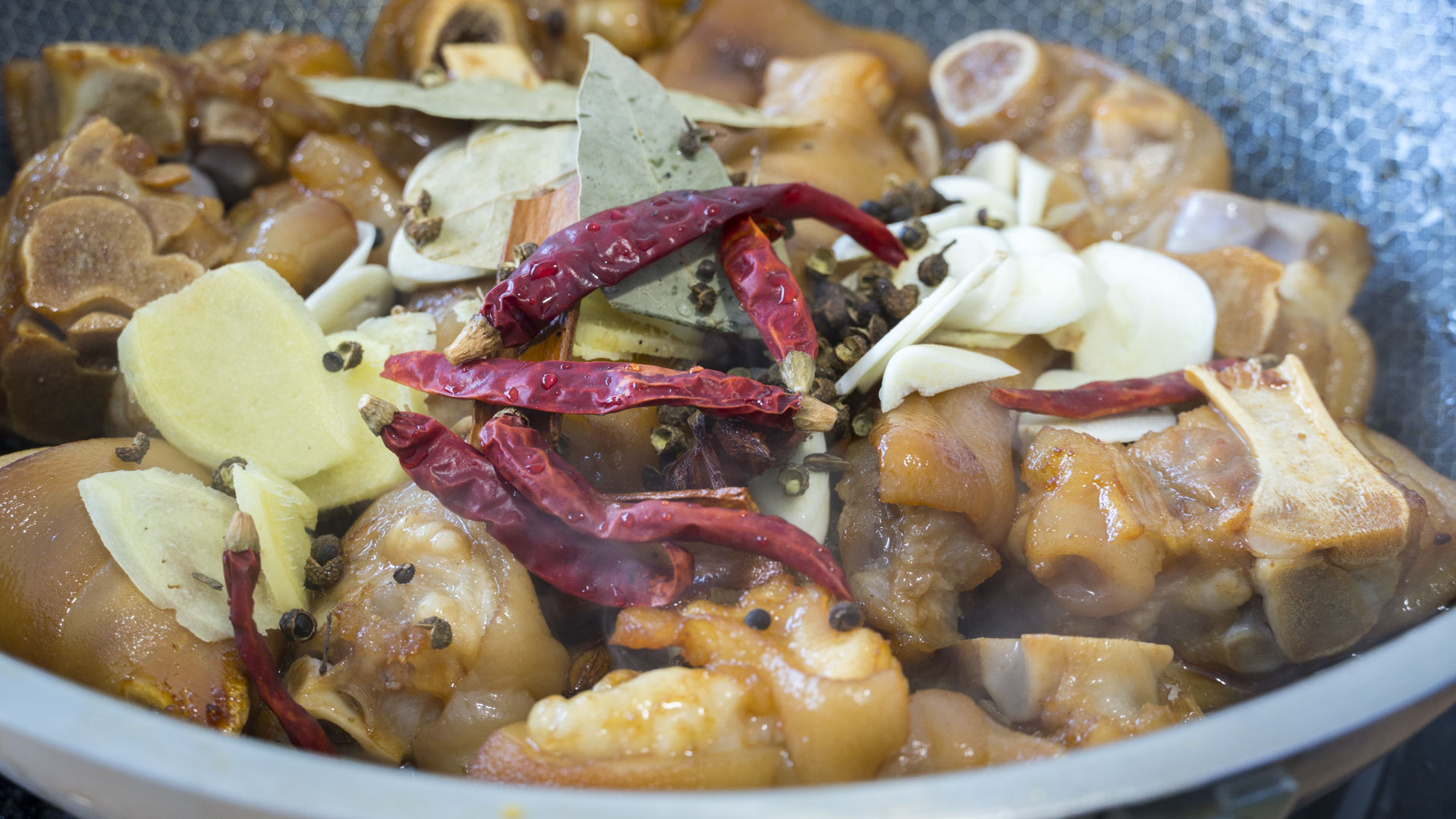 7、接著關火後蓋上蓋子繼續燜2個小時,讓豬蹄更加入味兒,2個小時後我們的滷豬蹄就做好了。